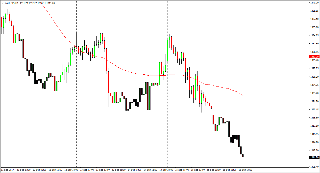 Gold markets are broken down significantly during the Monday session, capping at the open on Monday. We are now reaching towards the $1300 level, which is a significant support barrier based upon previous consolidation. I think we will see a significant attempt to pick the market back up in that area, but I would have to wait for some type of supportive action to start buying. In the meantime, it’s likely that we will continue to see sellers on rallies as the markets are starting to wind down the “risk off” trade in general, which of course is bad for gold itself. However, I wouldn’t take much to change attitudes again, as the North Korean situation continues to tense up. The gap above could be filled, which is near the $1320 level. However, it’s probably to take a lot of work to get there.