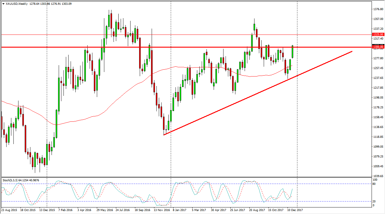 Gold markets rallied significantly during the trading of the last week, finally breaking out of the resistance barrier, and clearing the $1300 level. By doing so, it looks as if we are ready to go higher, perhaps reaching towards the $1325 level.