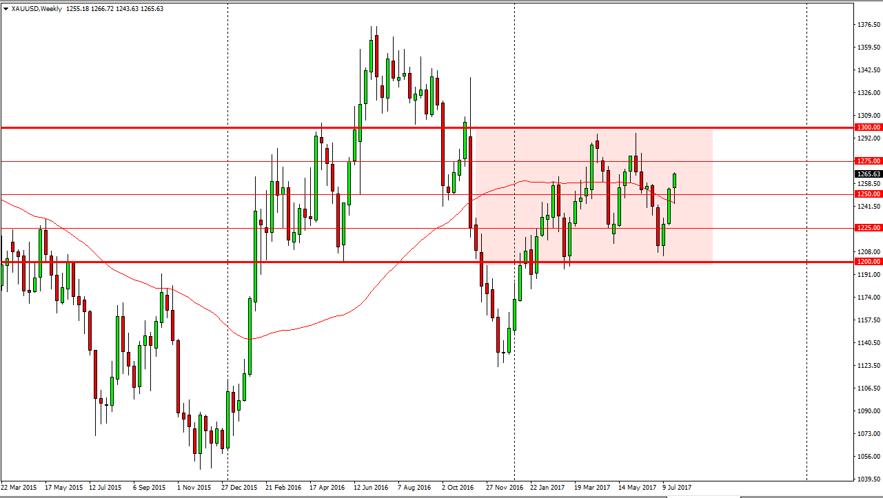 Gold markets initially fell during the week, but found enough support underneath the $1250 level to turn around and form a nice-looking hammer. The hammer