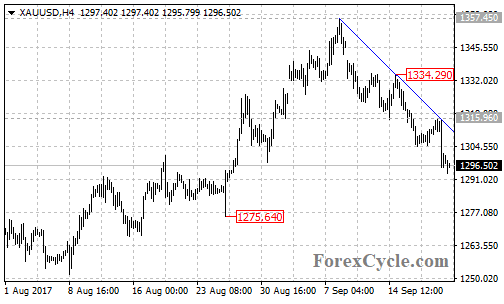 XAUUSD failed to break above the descending trend line from 1357.45 to 1334.29 on its 4-hour chart and extended its downside movement to as low as 1293.25.