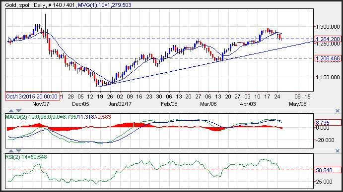Gold prices edged lower on Wednesday, as consumer confidence declined, paving the way for lower gold prices. The yellow metal hit a lower low, in addition to a lower high, which reflects a downtrend. Resistance is seen near the 10-day moving average at 1,279. Support is seen near an upward sloping trend line near 1,235. Momentum has turned negative as the MACD (moving average convergence divergence) index generated a crossover sell signal. The MACD line crossed below the MACD signal line as the MACD histogram moved from positive to negative territory. The index is printing in the red with a downward sloping trajectory which points to lower prices.