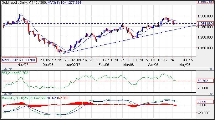 Gold prices continued to ease following the easing bias kept by the ECB. The yellow metal is poised to test support near an upward sloping trend line that comes in near 1,235. Resistance is seen near the 10-day moving average at 1,277. Momentum is negative as the MACD (moving average convergence divergence) index recently generated a crossover sell signal.