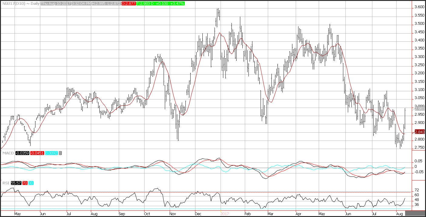 Gold prices continued to move higher on Thursday as President Trump ramped up his rhetoric on North Korea. Softer than expected U.S. PPI failed to weigh on the yellow metal. Prices are poised to test the June highs at 1,296, after hitting 1,287 on Thursday. Support is seen near the 10-day moving average at 1,267. Momentum remains positive as the MACD (moving average convergence divergence) histogram prints in the black with an upward sloping trajectory which points to higher prices.