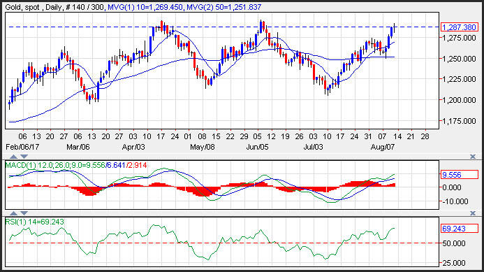 Gold prices continued to move higher on Friday, after breaking out this week and poised to test resistance near the June highs at 1,296. The standoff between the U.S. and North Korea is driving market volatility and generating demand for safe-haven assets such as gold. Softer than expected consumer inflation weighed on the dollar paving the way for higher gold prices. Support on the yellow metal is seen near the 10-day moving average at 1,269. Momentum is positive as the MACD histogram is printing in the black with an upward sloping trajectory which points to higher prices for the yellow metal.