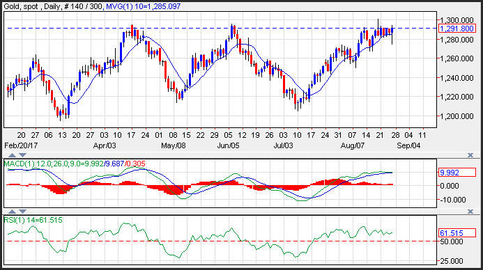 Gold prices whipsawed higher as the dollar lost ground following Janet Yellen’s speech at Jackson Hole which failed to discuss monetary policy. Yellen stuck to her topic which was financial regulation, which she defended in the wake of the financial crisis. Weaker than expected U.S. Durable Goods orders also buoyed gold prices. Resistance is seen near the August highs at 1,300, while support is seen near the 10-day moving average at 1,285.