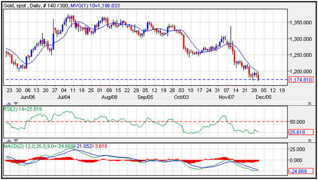 Gold prices moved lower hitting a fresh 9-month low as a stronger dollar and higher U.S. yields paved the way for lower gold prices. Resistance on the yellow metal is seen near the 10-day moving average at 1,196. A stronger than expected U.S. spending report buoyed the greenback. Momentum remains negative as the MACD (moving average convergence divergence) index prints in the red with a downward sloping trajectory which points to lower prices.