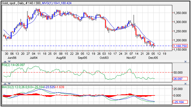 Gold prices continued to edge lower on Tuesday as a stronger than expected German Factory Orders buoyed yields paving the way for lower gold prices. Support on the yellow metal is seen near the July 2015 lows at 1,080. Resistance is seen near the 10-day moving average at 1,180. Gold prices remain oversold as the RSI(relative strength index) which is a momentum oscillator that measures overbought and oversold levels is printing a reading of 26, which is below the oversold trigger level of 30 and could foreshadow a correction.