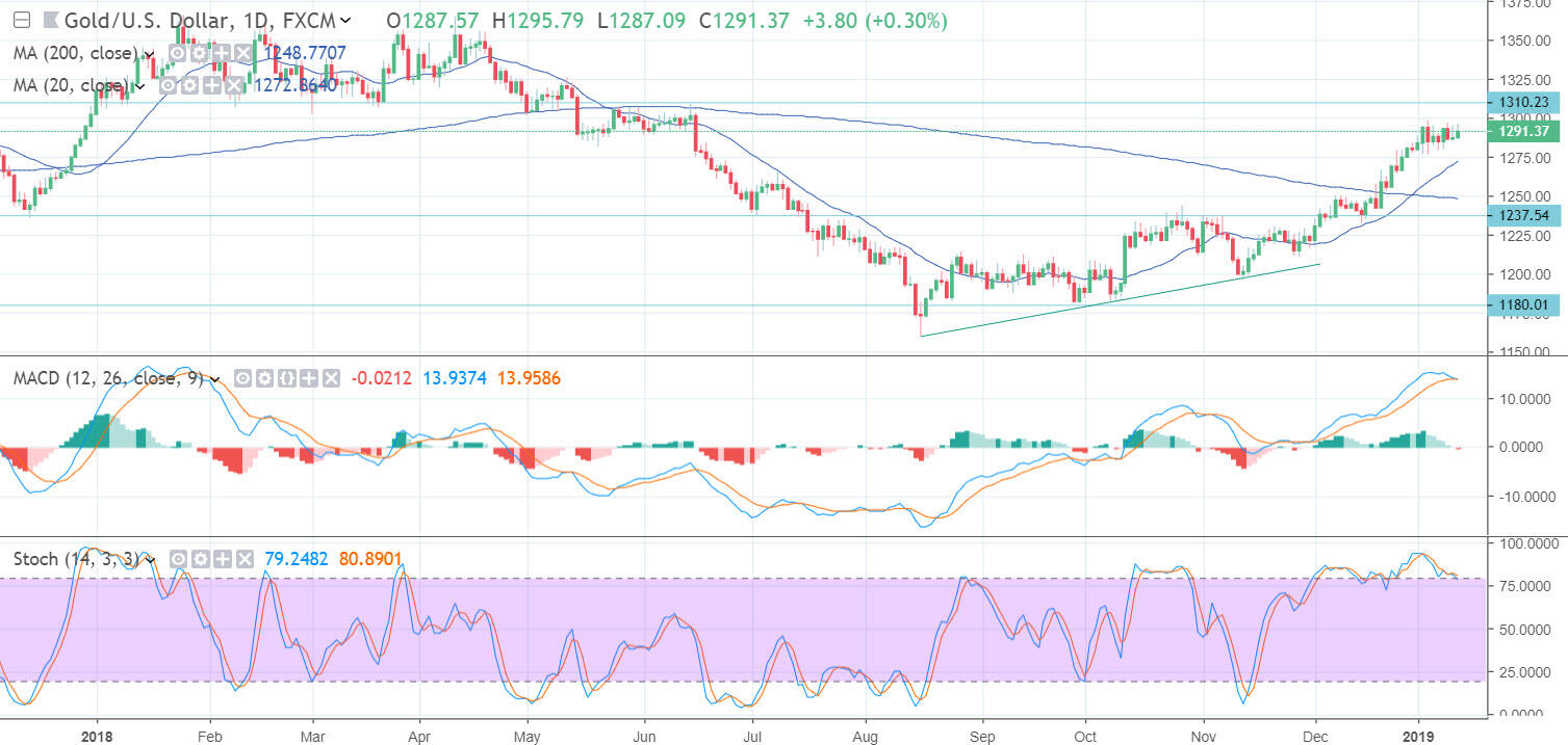 Gold prices remain range bound and are forming a bull flag pattern which is a pause that refreshes higher. Support is seen near the 20-day moving average at 1,272. Additional support is seen near the 200-day moving average at 1,248. The 20-day moving average recently crossed above the 200-day moving average, which shows that a medium-term up trend is in place. Short-term momentum has turned negative as the fast stochastic generated a crossover sell signal. Momentum, as reflected by the MACD (moving average convergence divergence) index, is also negative as the index generated a crossover sell signal. This occurs as the MACD line (the 12-day moving average minus the 26-day moving average) crosses below the MACD signal line (the 9-day moving average of the MACD line.