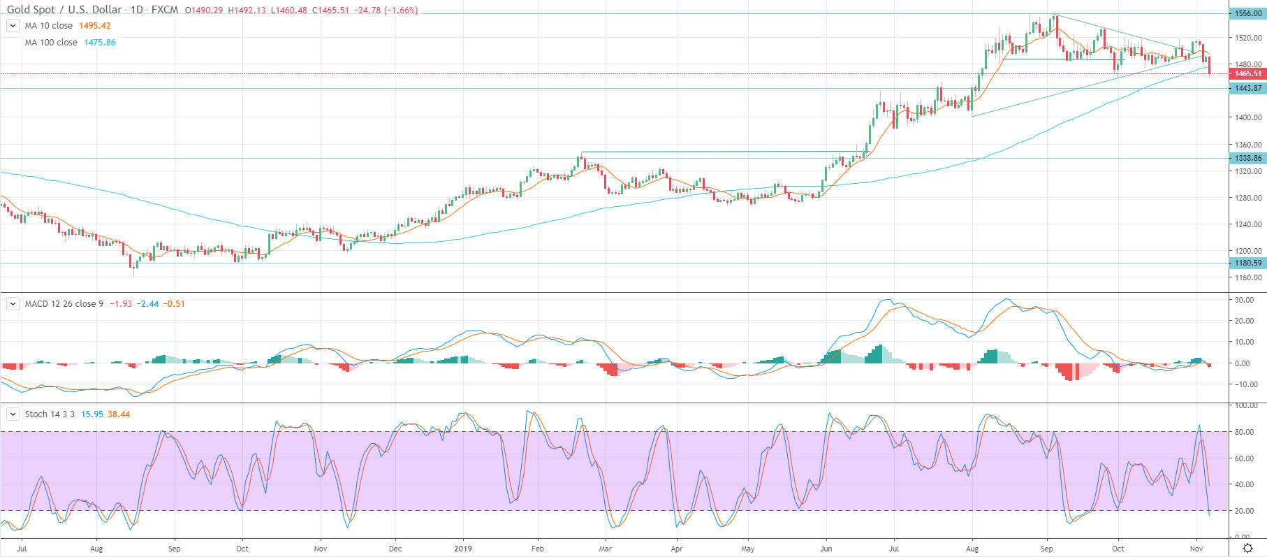 Gold prices tumbled Thursday as yields moved higher slightly through support near the 100-day moving average at 1,475, which is now seen as resistance. Support on the yellow metal is seen near the October lows at 1,426. Short term momentum has turned negative. The fast stochastic generated a crossover sell signal. Medium-term momentum has turned negative as the MACD (moving average convergence divergence) index generated a crossover sell signal. This occurs as the MACD line (the 12-day moving average minus the 26-day moving average, crosses below the MACD signal line (the 9-day moving average of the MACD line). The MACD histogram is printing in the red with a downward sloping trajectory which points to lower prices.
