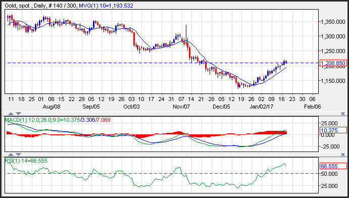 Gold prices edged lower as the dollar gained traction following a stronger than expected U.S. CPI that trumped the in line German CPI. Support on the yellow metal is seen near the 10-day moving average at 1,193. Resistance is seen near the October lows at 1,241. The RSI has dipped after printing a reading above 70, which is the overbought trigger level and could have foreshadowed a correction.