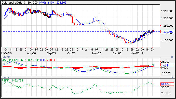 Gold prices moved lower as the dollar gained traction on Tuesday following a stronger than expected Japanese PMI report. The yellow metal found support near the 10-day moving average at 1,204. Resistance is seen near the mid-November highs at 1,231. Momentum is decelerating as the RSI moves lower with price action reflecting potentially lower prices.