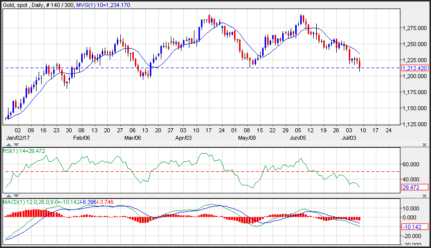 Gold prices moved lower as the Dollar gained traction in the wake of the stronger than expected U.S. payroll report. Prices hit fresh 4-month lows at 1,207, but rebounded into the close near support at 1,212. Prices are now oversold as the RSI (relative strength index) moved below the oversold trigger level of 30, which could foreshadow a correction.