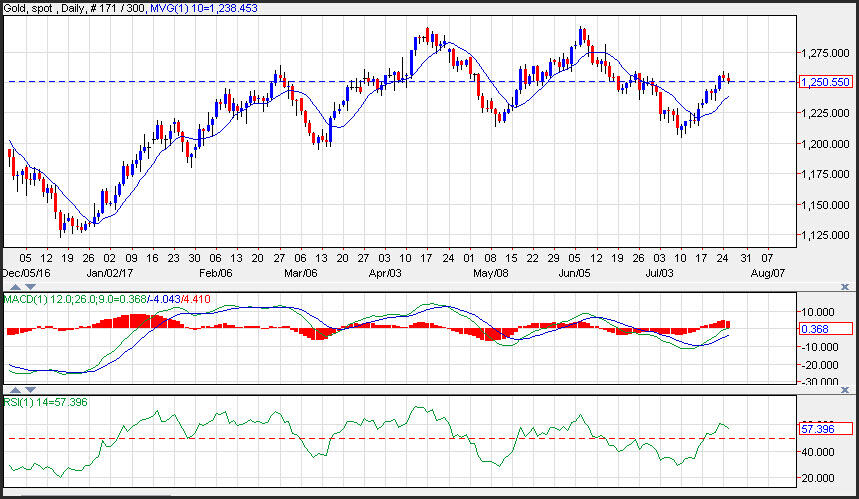 Gold prices consolidated on Tuesday edging lower as the dollar gained traction as U.S. yields moved higher. Weaker than expected German import price inflation took some of the luster out of the yellow metal. Support on gold is seen near the 10-day moving average at 1,238. Resistance is seen near the weekly highs at 1,258. Momentum remains positive as the MACD (moving average convergence divergence) histogram prints in the black with an upward sloping trajectory which points to higher prices. Prices are forming a triple top and would need to eclipse the 1,295 level to avoid this scenario.
