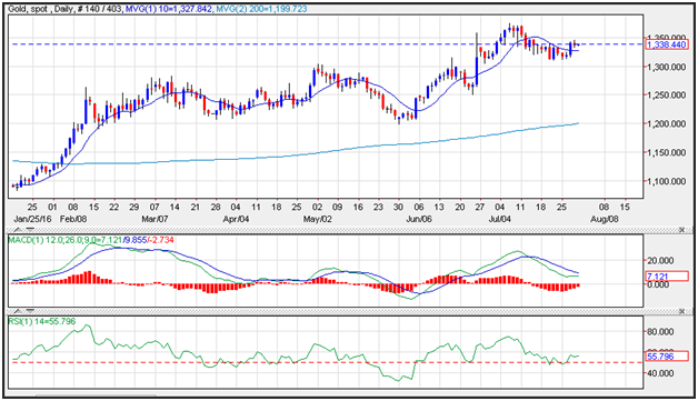 Gold prices edged slightly lower on Thursday but remained above support near the 10-day moving average at 1,327. Resistance on the yellow metal is seen near the July highs at 1,370. A wider than expected U.S. trade goods report kept gold prices capped. While momentum remains negative it is poised to turn positive as the MACD is set to generate a buy signal.