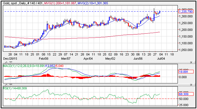 Gold prices moved higher on Friday forming a bull flag pattern which is a continuation pattern in the form of a pause that refreshes. This comes following softer than expected Chinese PMI data released on Friday. Resistance is seen near the June highs at 1,358. Support is seen near the 10-day moving average at 1,301. Momentum is positive as the MACD (moving average convergence divergence) prints in the black with an upward sloping trajectory which points to higher prices.