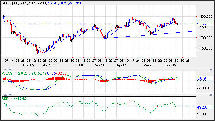 Gold prices rebounded off the lows of the session on Tuesday ahead of the Fed meeting this week. The Fed is widely expected to increase interest rates by 25 basis points, but to point to recent weakness in the retail space. Prices bounced near 1,258, but continue to trade below resistance near the 10-day moving average at 1,274. Support is seen near an upward sloping trend line that comes in near 1,225. Momentum has turned negative as the MACD (moving average convergence divergence) index generated a crossover sell signal. This occurs as the spread (the 12-day exponential moving average minus the 26-day exponential moving average) crosses below the 9-day exponential moving average of the spread.