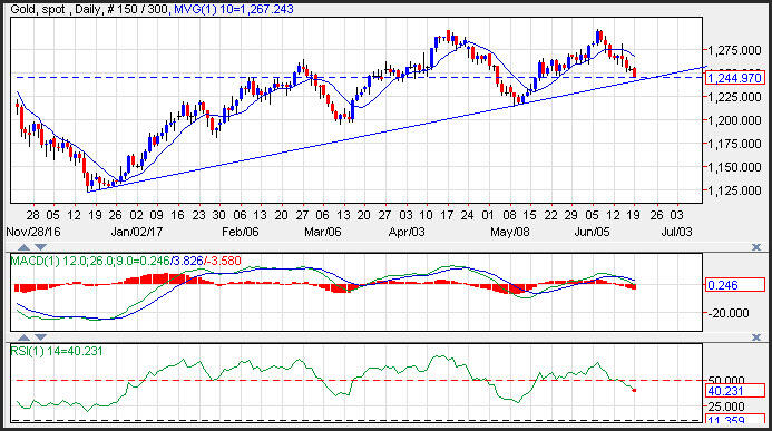 Gold prices are trading under pressure following the hawkish tone from the Fed that was delivered last week following their decision to raise interest rates. Prices are poised to test trend line support generated from an upward sloping trend line that comes in near 1,240. A break of this level would lead to a test of the May lows near 1,216. Resistance on the yellow metal is seen near the 10-day moving average at 1,267.