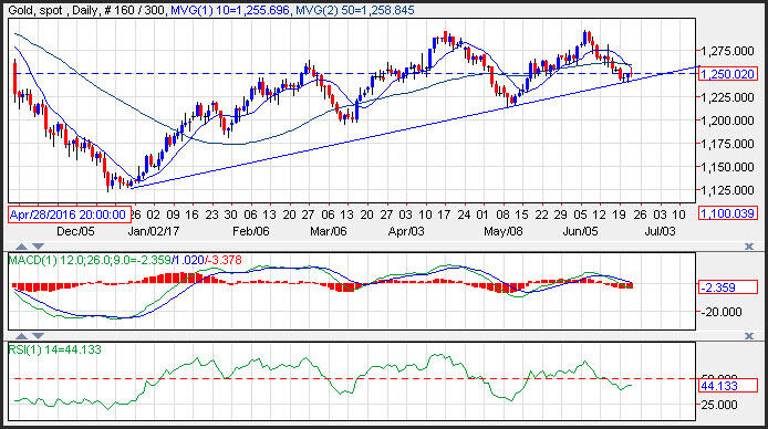 Gold prices attempted to move higher on Thursday but were unable to gain traction and eventually closed unchanged forming a doji day which reflects indecision. Resistance is seen near the 10-day moving average at 1,255. The 10-day moving average has just crossed below the 50-day moving average which shows that a short-term downtrend is now in place. Prices are hovering just above support seen near an upward sloping trend line that comes in near 1,240. A break of this level would likely lead to a quick test of the May lows at 1,215.