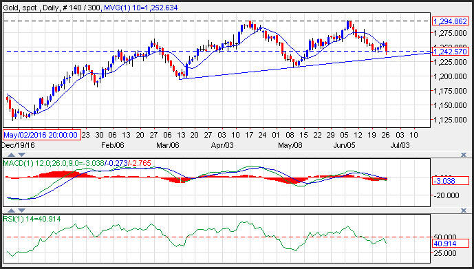 Gold prices moved lower on Monday, as riskier assets gained traction following Italy’s move to buoy failing banks. The dollar gained traction paving the way for lower gold prices. Prices tumbled down and is poised to test target support near an upward sloping trend line that comes in near 1,233. Resistance on the yellow metal is seen near the 10-day moving average at 1,252. Momentum remains negative as the MACD (moving average convergence divergence) histogram prints in the red with a downward sloping trajectory which points to lower prices for the yellow metal.