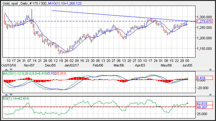 Gold prices broke out, moving above a downward sloping trend line that connects the highs in November to the highs in April and comes in near 1,279. Support on the yellow metal is seen near the 10-day moving average at 1,265. The next level of target resistance on gold prices is seen near the April highs at 1,294. A break of this level would lead to a test of the November 8, highs at 1,337.