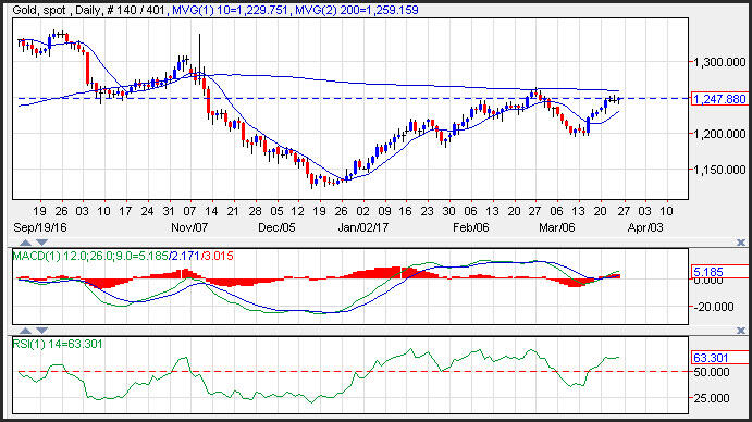 Gold prices moved higher as the Euro gained traction and the dollar edged lower following stronger than expected German PMI Data. The yellow metal is poised to test target resistance near the 200-day moving average at 1,259. Additional resistance is seen near the February highs at 1,263. Support is seen near the 10-day moving average at 1,229. Momentum is positive as the MACD (moving average convergence divergence) index prints in the black, with an upward sloping trajectory, after recently generating a crossover buy signal, which now points to higher prices.