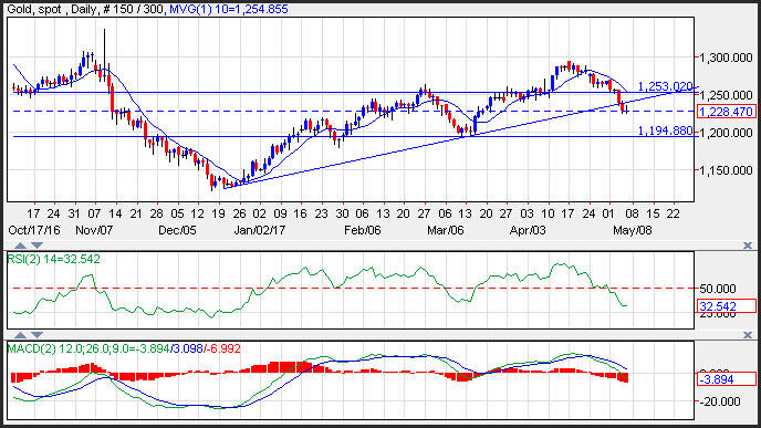 Gold prices attempted to move higher but hit resistance and was unable to gain further traction, easing lower into the close, following the stronger than expected U.S. Non-farm payroll report. Prices broke through and upward sloping trend line that was robust support generated from connecting the lows in December of 2016, to the lows in March and comes in near 1,240. Additional resistance on the yellow metal is seen near the 10-day moving average at 1,254. Target support on gold prices is seen near the March lows at 1,194.