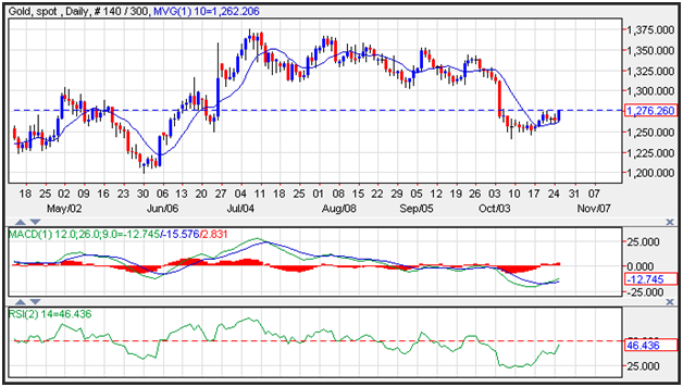 Gold prices gained ground shooting above resistance levels near last week’s highs at 1,270, which is now seen as short term support. Additional support is seen near the 10-day moving average at 1,262. Resistance is now seen near the September lows at 1,300. Tuesday’s softer than expected consumer confidence numbers, reduced the value of the dollar and allowed the yellow metal some room to run.