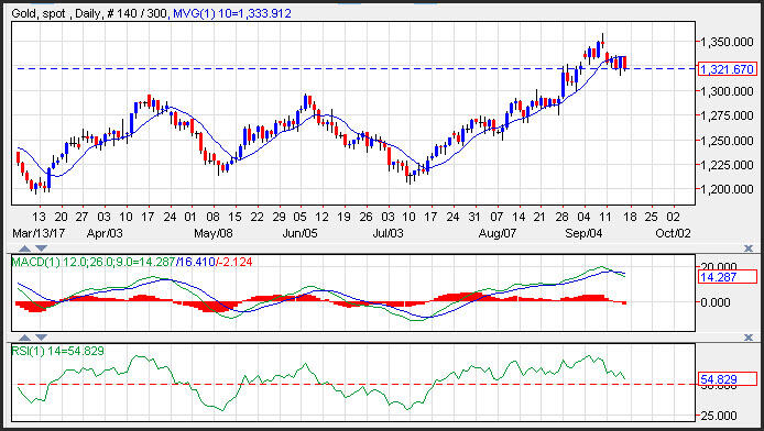 Gold prices were unable to hold on to Thursday’s gains and whipsawed back to the lows seen on Wednesday. Prices are consolidating and the markets now seem to take missile tests in stride. Support on the yellow metal is seen near the weekly lows at 1,315. Resistance is seen near the 10-day moving average at 1,333.