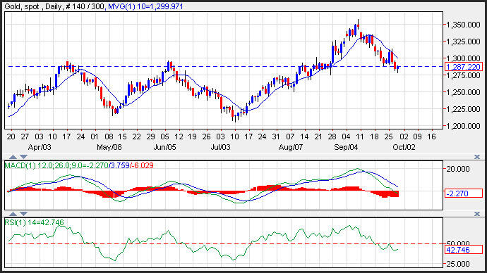Gold prices rebounded from session lows closing up on the session, as inflation continues to remain buoyed in Europe. The dollar finally took as respite after climbing most of the week, which paved the way for the yellow metal to rebound. Support is seen near the August 24, lows at 1,275, and resistance is seen near the 10-day moving average at 1,299. Momentum remains negative as the MACD (moving average convergence divergence) histogram prints in the red with a downward sloping trajectory which points to lower prices.