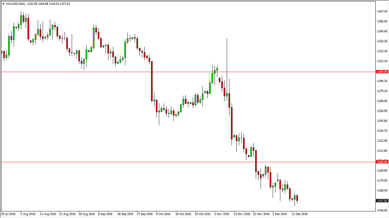 The gold markets fell slightly on Tuesday, as the market continues to have a bit of negativity in it. I believe that any rally at this point time will be a selling opportunity on signs of exhaustion, and the signs of exhaustion should come rather quickly. I still have a target of $1100 level below, and then eventually the $1000 level below. The $1200 level above continues to be the “ceiling” in this market, and as a result I feel that it’s only matter time before the sellers get involved. I have no interest whatsoever in buying.