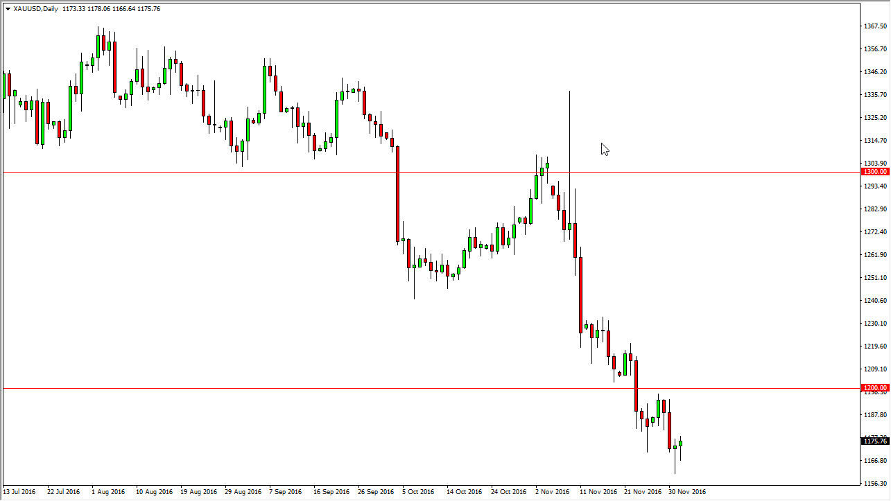 Gold markets had a choppy day on Friday, after the jobs number came out not only as expected as far as the addition of jobs, but came out a bit underwhelming as far as wage gains were a mere 0.1% for the month of November. Because of this, I believe that we could get a little bit of a bounce, but I still believe a significant amount of resistance of the $1200 level. With this, I am waiting for higher prices to start shorting yet again. If we break down below the bottom of the Thursday candle, that is a selling opportunity as well.
