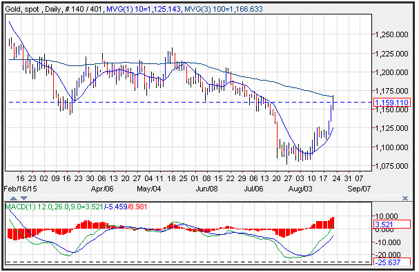 Gold prices moved higher on Friday, notching up its 3rd consecutive higher close, running into its 100-day moving average at $1,166. It also pushed