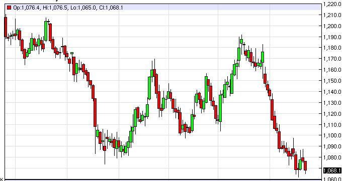 Gold markets fell during the course of the session on Monday, as we continue to test the lows again. Ultimately, if we make a fresh, new low we believe that this market will then reach towards the $1050 level, and then eventually the $1000 level. We have no interest whatsoever in buying this market, and look at any bounce at this point in time as a potential selling opportunity. We believe that the US dollar strengthening overall will continue to work against the value of the precious metals markets. Gold of course will be any different.