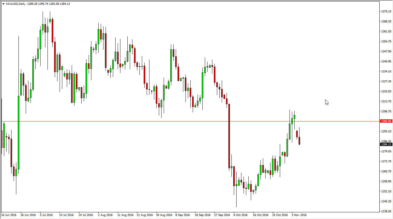 Gold markets gapped lower at the open on Monday, and then continue down towards the $1280 level. There is a significant amount of support just below, and this was of course in reaction to the FBI announcing that they were suspending the investigation into the email server of Hillary Clinton. However, the elections are today so it’s very likely that the market could be quiet. A supportive candle could be reason enough to go long again, as it is difficult to sell just above all this noise. Because of this, I’m going to sit on the sidelines today.