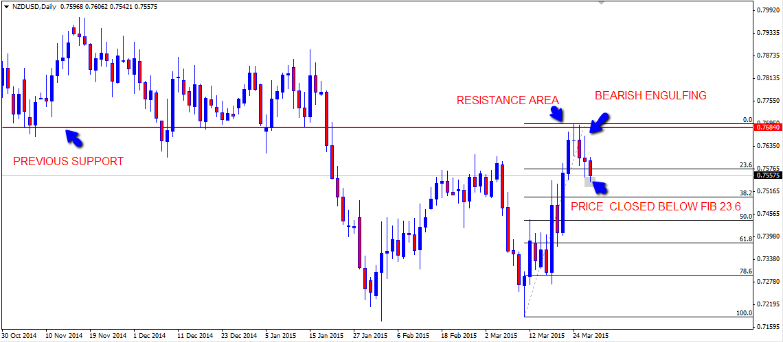 NZD/USD as seen in the image has been rejected on the daily time frame with bearish engulfing bar, and price action suggests that the pair is in for some more downside move for the week as price closed below the fib level 23.6 at the end of the week. With the bearish movement still intact, the downside bias should see the pair in the zone of 0.743, 0.740.