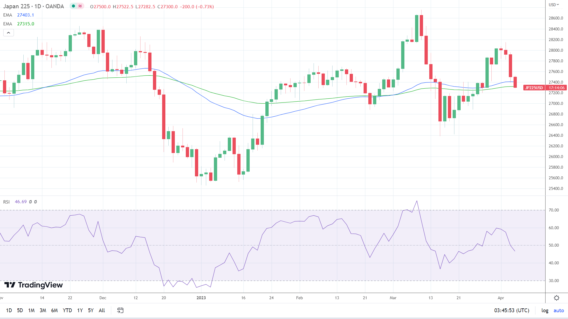 The Nikkei 225 was down 0.73% this morning, with a weaker USD/JPY a drag.