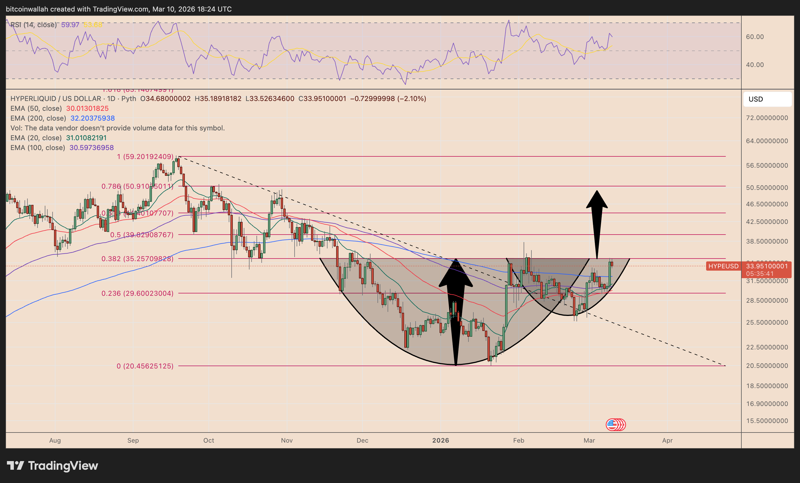 On the daily chart, HYPE appears to have completed a rounded bottom between November and late January, forming the “cup” portion of the pattern after a prolonged decline from its peak near $59.