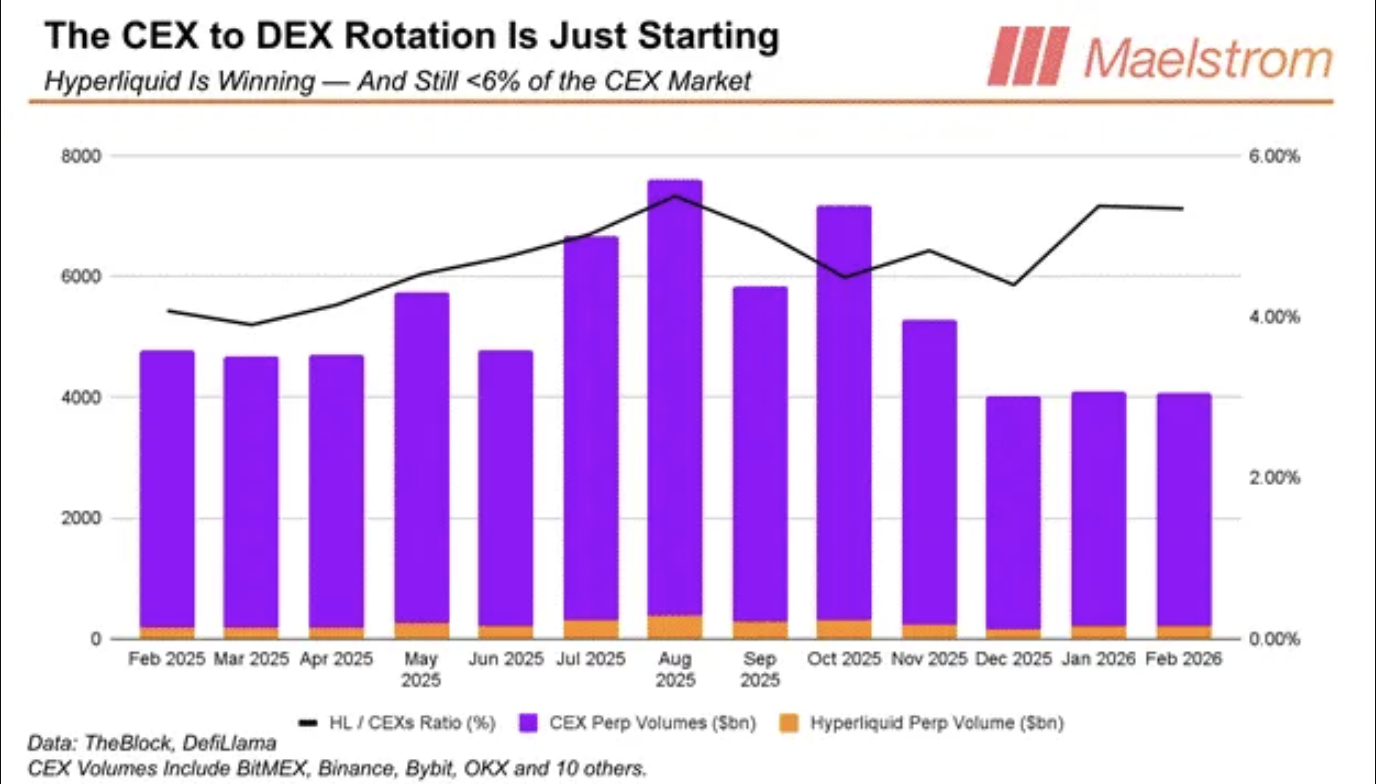 He argues Hyperliquid can keep pulling perpetual volume away from centralized exchanges and expand into new macro-linked markets, lifting its 30-day annualized revenue run rate to about $1.4 billion from roughly $843 million in March.