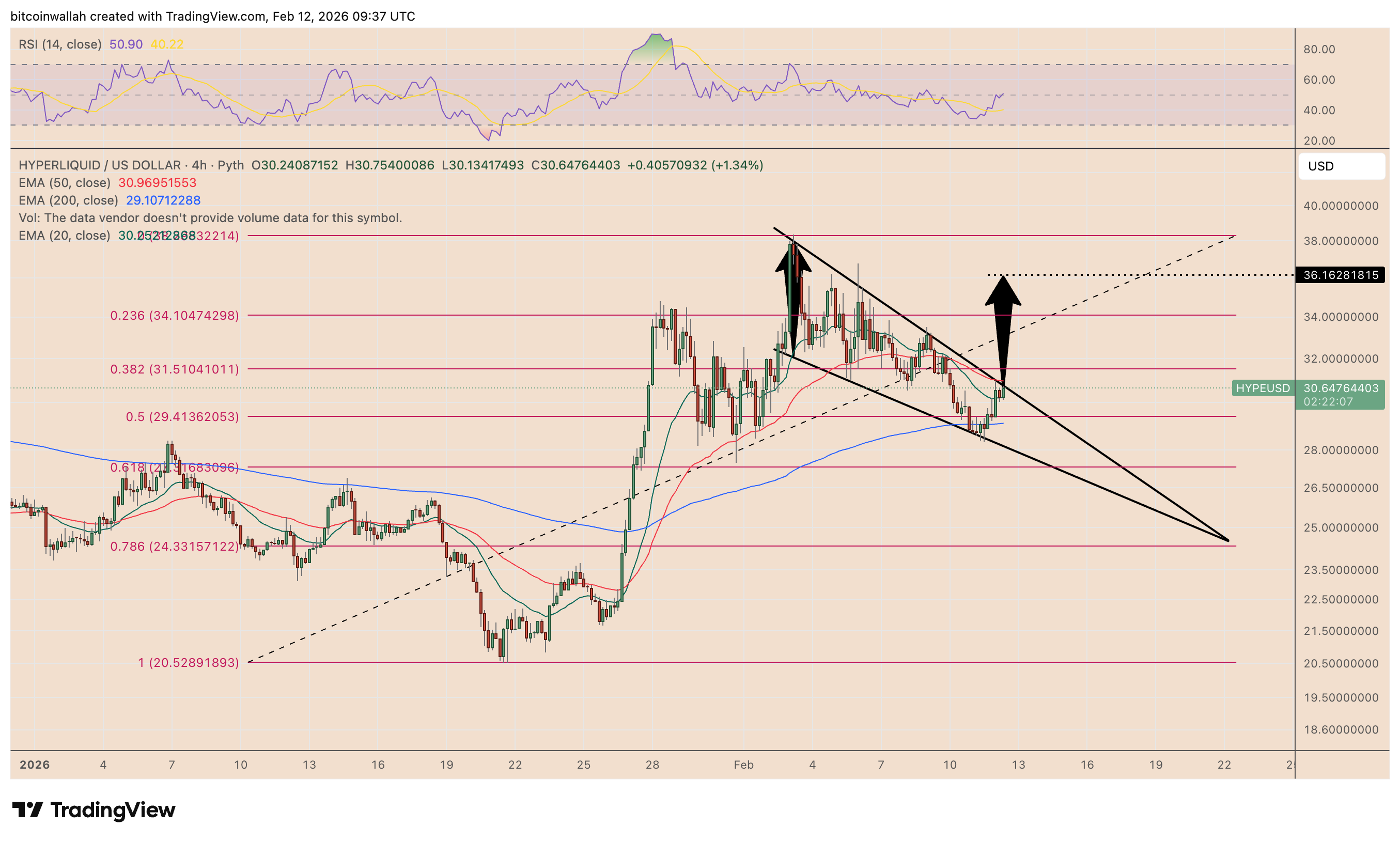 Hyperliquid’s HYPE token trades inside a falling wedge on the four-hour chart, a pattern that typically resolves to the upside once price clears descending resistance.