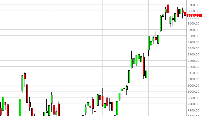The IBEX futures market fell slightly during the session on Wednesday, losing about .22%. With that being said, we are still well within the tolerances of the recent consolidation area, and as such a pullback in this point time is hardly anything to be concerned about. In fact, we see quite a bit of support at the €8500 level, and do not expect this market to break down below there or much farther for that matter. Even if it did, we still see a kind of support every hundred euros below there. Because of this, we are only buying this market and are looking for the right supportive candle from which to start doing so. At this moment in time, we think this market simply grinding sideways and take a breath from the recent bullish action we see.