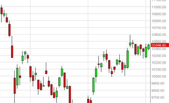 The Ibex had a slightly positive session during the day on Tuesday, as we try to reach towards the €10,500 level. The €10,600 level above is resistance,