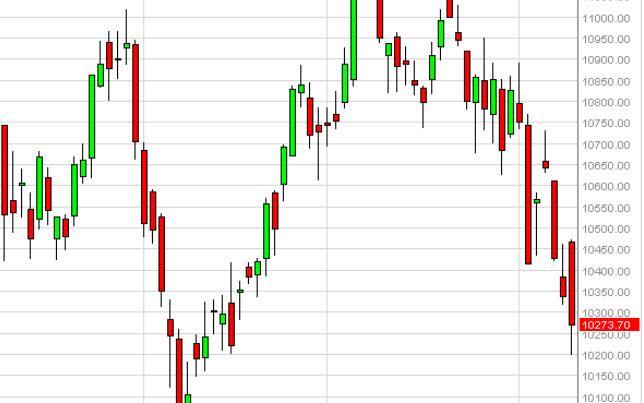 The IBEX as you can see gapped higher at the open on Wednesday, and then fell straight back down, crashing all the way down to the €10,200 level. The market looks as if it is ready to continue falling in the short-term, so we feel that short-term traders will continue to sell this market. It looks as if the 10,000 level is supportive, and as a result we are buyers on any type of supportive action in that region. A move below there has us turning very bearish on Spanish stocks. Until then, we are looking only to sell on the shortest of time frames.