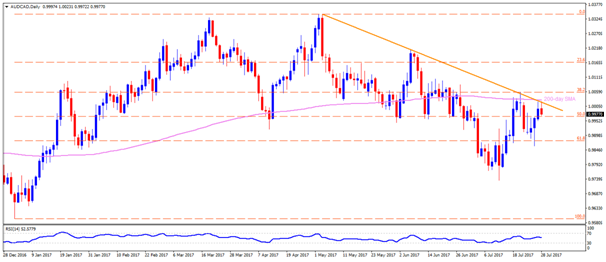 AUD/CAD Even after bouncing off from 0.9870-60 support-zone, the AUDCAD failed to surpass the 1.0020-30 resistance-confluence, comprising 200-day SMA