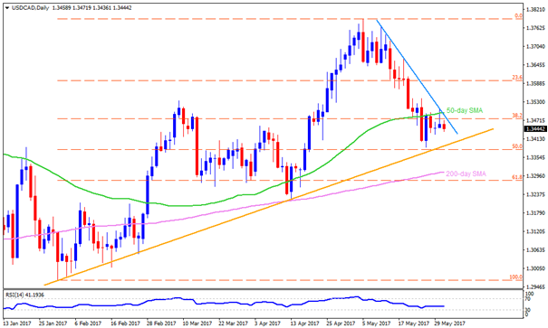 USD/CAD With the three-week old descending trend-line, coupled with 50-day SMA, restricting the USDCAD’s near-term advances around 1.3495 – 1.3500, the