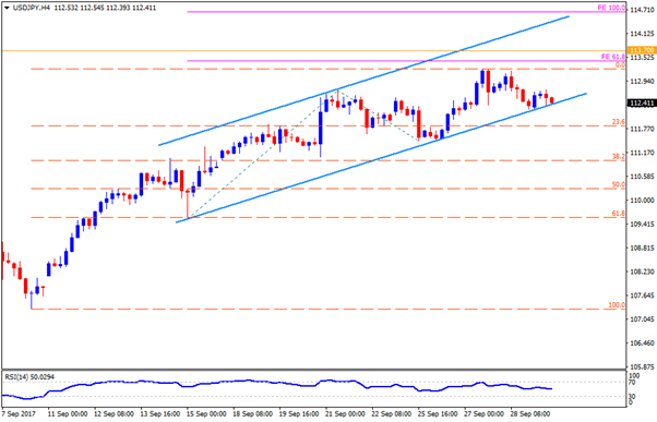 With a fortnight long ascending trend-channel support restricting the USDJPY’s downturn, chances of the pair’s extended recovery towards the 113.25, the 113.45 and then to the 113.70 seems quite acceptable. However, the 114.00 round-figure and the channel-resistance of 114.40 might confine its following advances, failing to which can further propel the north-run in direction to 114.65 and the 115.10 upside numbers. On the contrary, pair’s break of channel-support, at 112.30 now, can quickly fetch it to 111.40 and to the 110.70 rest-points. Moreover, during the quote’s sustained decline below 110.70, the 110.25, the 109.90 and the 109.20 could entertain the sellers.
