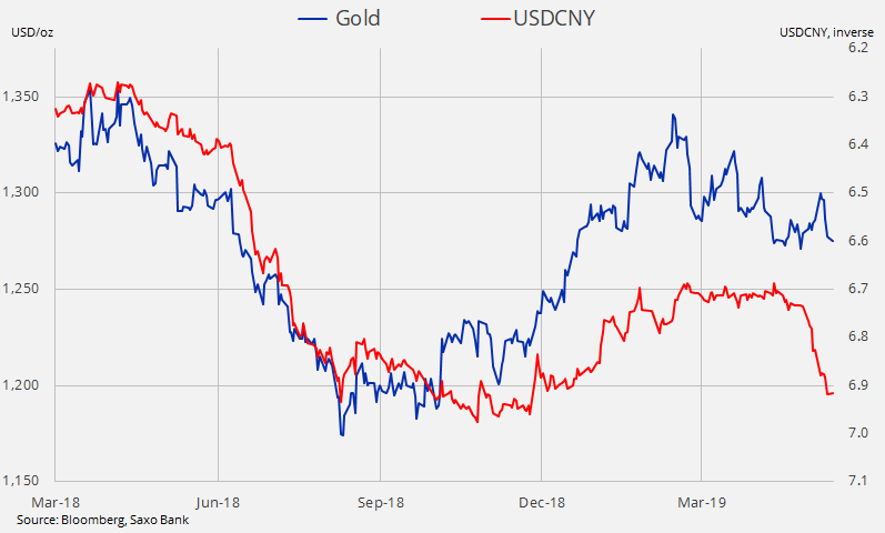 The currency market is potentially posing the biggest short-term challenge with the dollar increasingly behaving as the only safe haven at this stage. Not only against G7 but more importantly against the Chinese renminbi where speculation continues to focus on whether the PBoC is going to allow the currency to weaken below $7. Gold’s sell-off between March and July last year coincided with the weakness in CNY as China responded to the opening salvo by the US in the ongoing trade war.