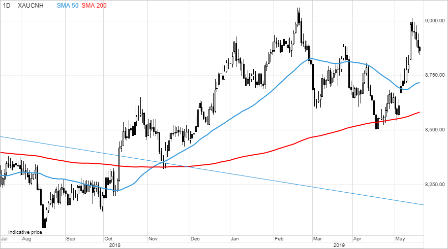 Gold’s retracement from $1,300/oz coincided with XAUCNH finding resistance at 9,000.