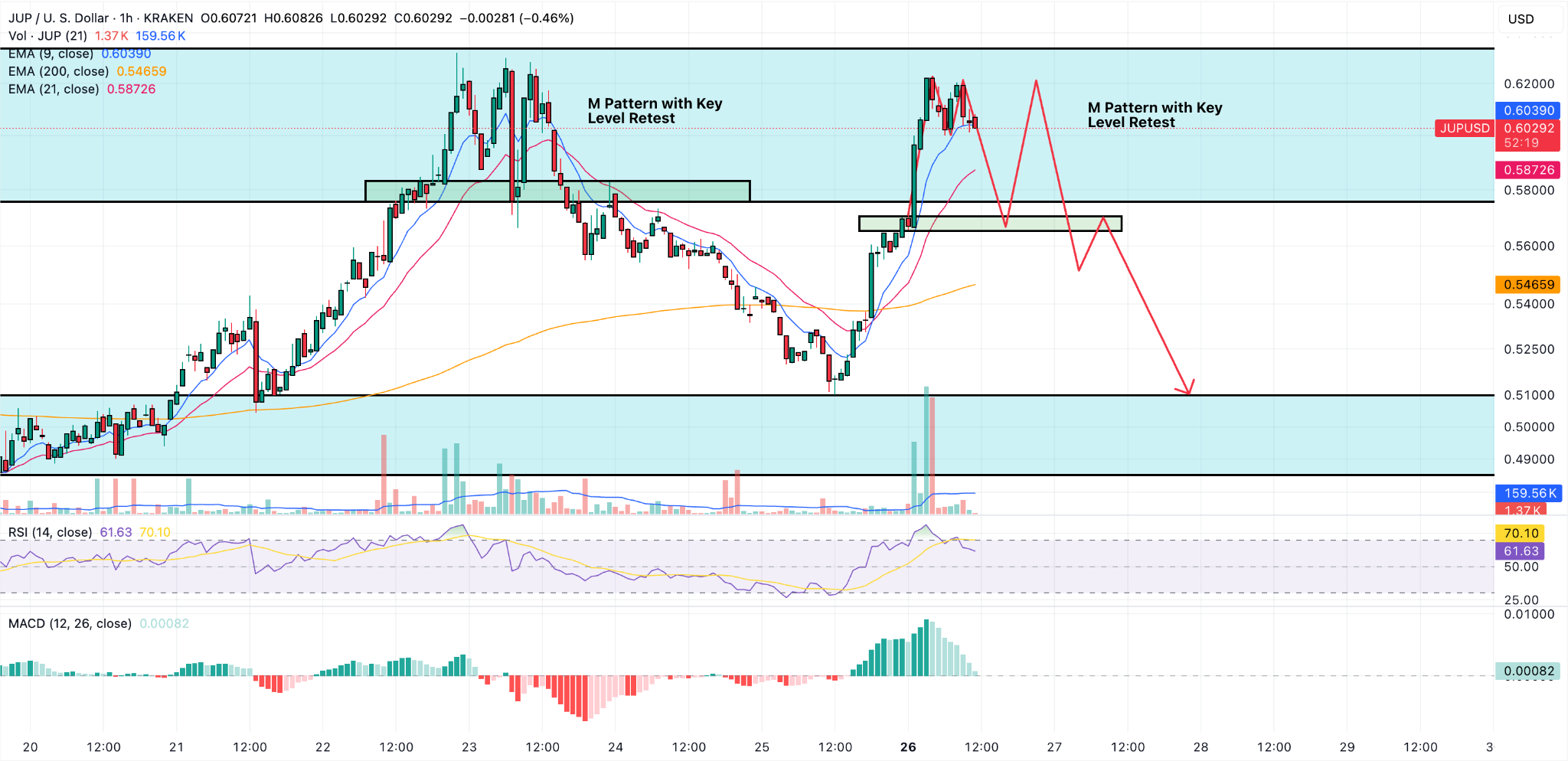 JUP seems on track to hit the 200-day exponential moving average (EMA), which currently stands at around $0.67.