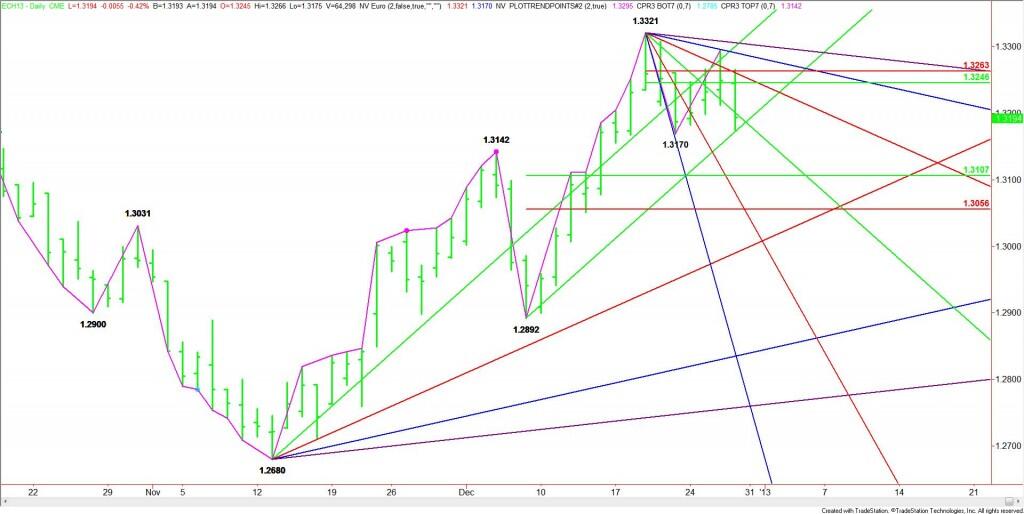 The possibility of the fiscal cliff talks breaking down over the next few days has traders on edge. This is creating a potentially volatile situation. Based on the daily chart, the market is likely to accelerate to the upside through 1.3321 or to the downside through 1.3170.