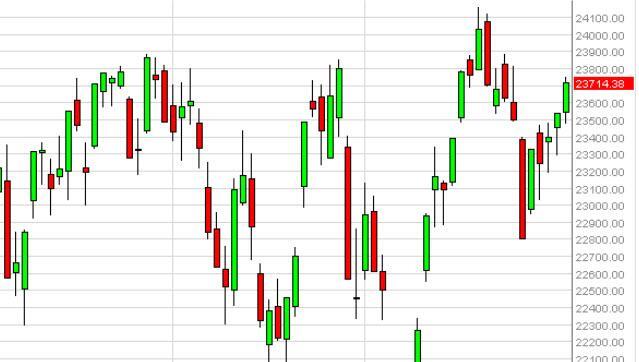 The MIB broke higher during the course of the session on Monday, clearing the top of the hammer that had formed on Friday. Because of this, we believe that this market continues to grind higher, probably aiming for the next large round number in the form of 24,000 at this point in time. We are buyers of short-term pullbacks, and do believe that ultimately this market should break out to the upside and continue to go much higher given enough time. Longer-term, we anticipate that the 25,000 level will almost certainly be tested again.